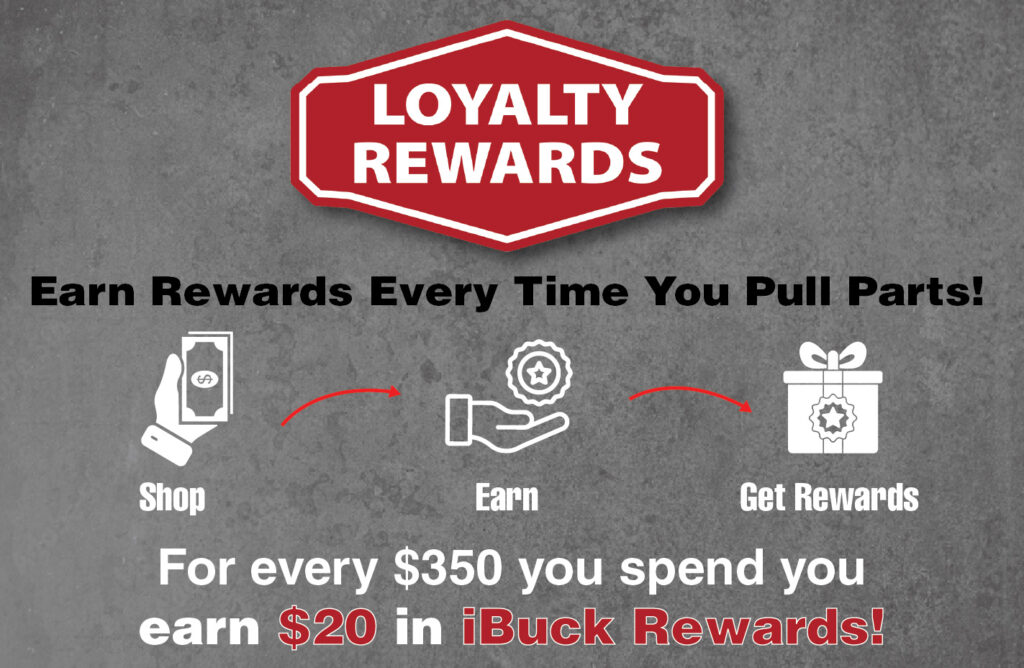 *iPull-uPull Auto Parts has the right to change, modify or terminate the iBuck Rewards Program at any time without notice and without liability to iPull-uPull Auto Parts. See store for details. See Terms and/or Privacy for more information.